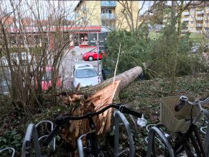 Entwurzelte Bäume, heruntergefallene Äste und Dachziegel – 14 Mal mussten die Abteilung ausrücken. Unter anderem blockierte ein Baum die Zu- und Abfahrt des Diakonissenkrankenhauses, welcher mit Hilfe der Motorkettensäge schnell zerkleinert wurde. Im Dammerstock musste ein abgebrochener Ast sicher zu Boden gebracht werden, nachdem dieser sich in einem anderen Baum verfangen hatte. Ein Teil eines Daches musste in der Lange Straße gesichert werden. Auch musste mit Hilfe einer Drehleiter ein Baum gefällt werden, welcher drohte auf ein Haus zu fallen. Insgesamt waren 16 Kameraden, mit drei Fahrzeugen über acht Stunden im Einsatz.
